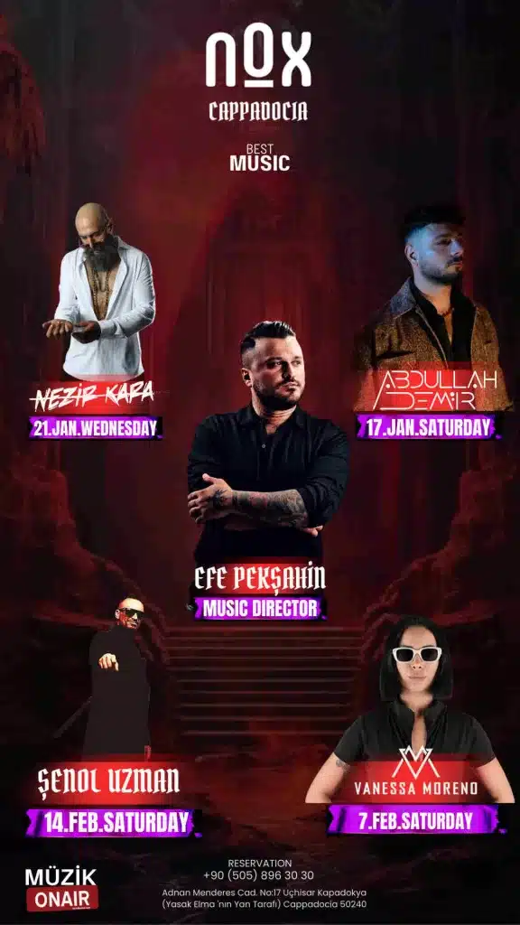 Müziğin küratörlüğü, global sahnelerdeki deneyimiyle tanınan Müzikonair Global Müzik Direktörü Efe Pekşahin’e emanet. Uluslararası müzik vizyonu, NOX Kapadokya gecelerine rafine ve evrensel bir karakter kazandırıyor.